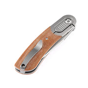 - Ergonomic brown micarta and titanium handle with titanium bolster for a smooth gripping surface that is comfortable in the pocket or hand.