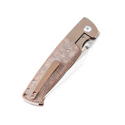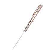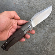 - Ergonomic brown micarta handle with titanium bolster for a smooth gripping surface that is comfortable in the pocket or hand.