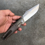 - Stonewashed, clip point blade made from CPM-20CV stainless steel.