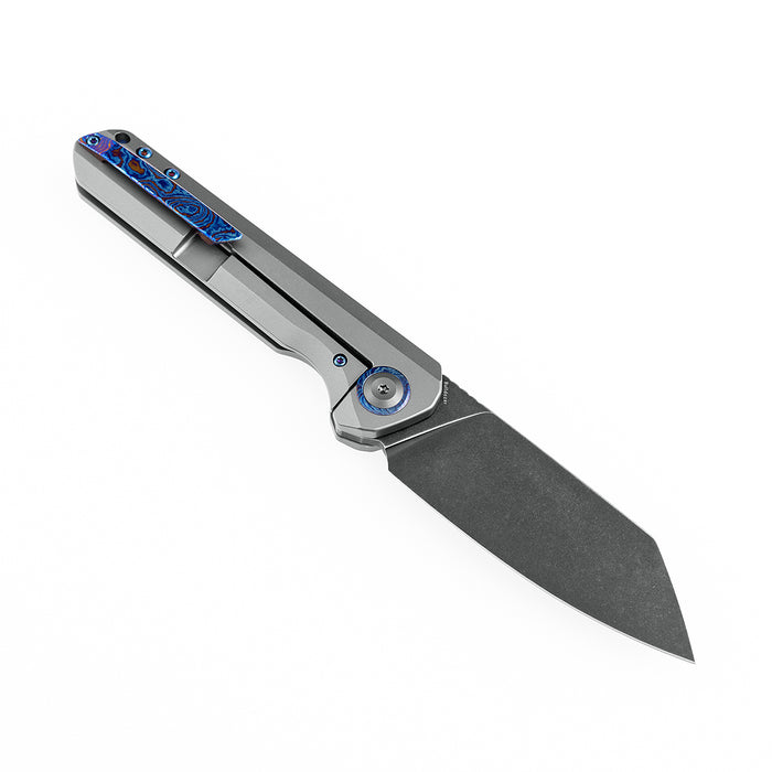 ✔Gray Anodized Titanium Handle + Timascus Clip handle for a smooth gripping surface that is comfortable in the pocket or hand.