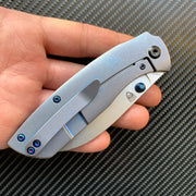 - Ergonomic blue anodizedĀ titanium handleĀ for a smooth gripping surface that is comfortable in the pocket or hand.