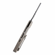The Leviathan features an ergonomic contoured titanium handle, complemented by a titanium pocket clip for secure and convenient carry. -