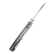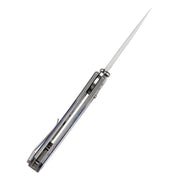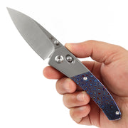 The handle is made from a combination of titanium and Fatcarbon/Carbon Fiber/Timascus/Micarta, offering both strength and visual appeal. The handle features a subtle curvature that naturally fits the contours of the hand, with chamfered edges for a smooth and comfortable grip.