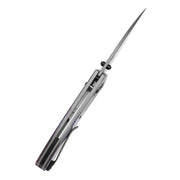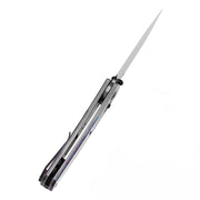 The handle is made from a combination of titanium and Fatcarbon/Carbon Fiber/Timascus/Micarta, offering both strength and visual appeal. The handle features a subtle curvature that naturally fits the contours of the hand, with chamfered edges for a smooth and comfortable grip.