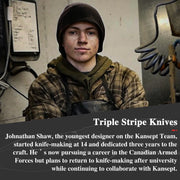 As an 18-year-old Canadian knifemaker, Johnathan Shaw is the youngest designer on the Kansept Team. From a very young age Johnathan had a keen interest in knives and tools. When this interest crossed paths with working with his hands, a brand-new fixation was formed: knifemaking. At age 14 he took a headlong dive into the craft and dedicated himself to creating the best knives he could. This lasted for just three years, as Johnathan recently closed his shop to begin a career in the Canadian Armed Forces as an Engineer Officer. While he is currently no longer able to make knives, he plans to return after university and start again. Until then, Johnathan will continue to work with companies like Kansept Knives to bring his designs to market.