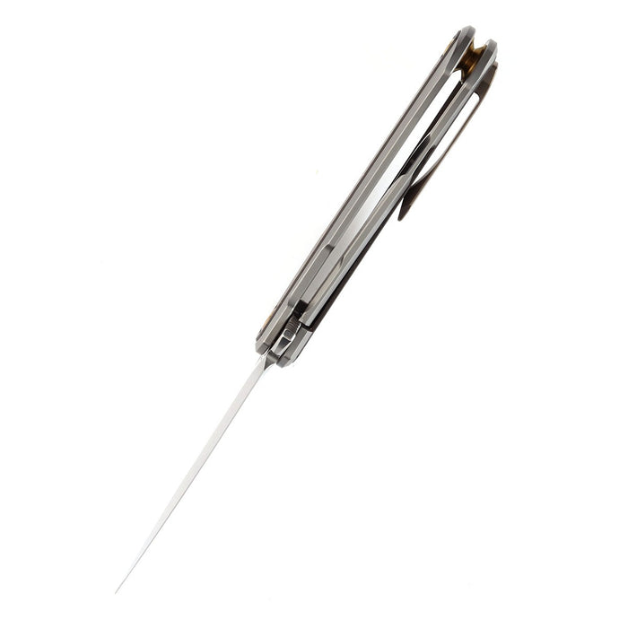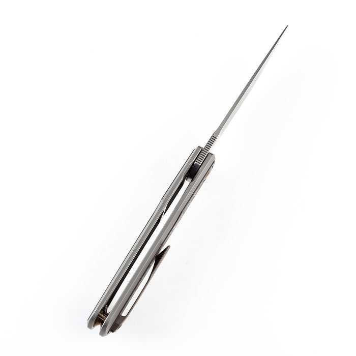 - Titanium Handle + Copper Carbon Fiber Inlay handle for a smooth gripping surface that is comfortable in the pocket or hand.