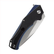 - Ergonomic two-tone black G10 and anodized dark blue stainless steel handle for a smooth gripping surface that is comfortable in the pocket or hand.