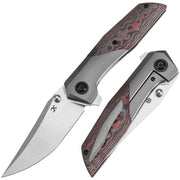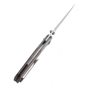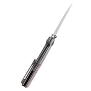 The Deadite features an ergonomic handle made from titanium alloy and carbon fiber, with a dual-material configuration designed to enhance its visual appeal. The smooth, contoured design provides strength and durability, while the combination of materials adds a sleek, modern aesthetic to the knife. -