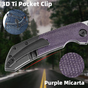 ✔Blackwash Titanium + Purple Micarta handle for a smooth gripping surface that is comfortable in the pocket or hand.
