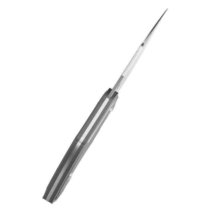 The knife features a titanium handle with multiple chamfered edges, providing a seamless fit in the hand. The ergonomic design ensures a comfortable grip, making it feel natural and secure during use. -
