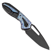 -The handle features a dual-material construction, seamlessly combining titanium with carbon fiber or Timascus inlays. This combination of materials enhances both the aesthetics and the tactile experience of the knife, adding a touch of elegance and sophistication to its design.