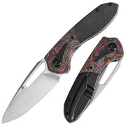 -The handle features a dual-material construction, seamlessly combining titanium with carbon fiber or Timascus inlays. This combination of materials enhances both the aesthetics and the tactile experience of the knife, adding a touch of elegance and sophistication to its design.